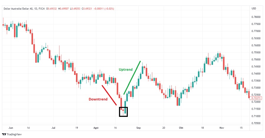 Lalu ada Hammer dan Shooting Star. Dua pattern ini mirip-mirip bentuknya, tapi konteksnya beda. Hammer muncul di dasar tren turun, tandanya buyer mulai masuk dan harga siap naik. Sebaliknya, Shooting Star muncul di puncak tren naik, sinyal harga bakal berbalik arah ke bawah. Keduanya punya body kecil dan ekor panjang, yang menunjukkan tekanan dari sisi yang berlawanan.